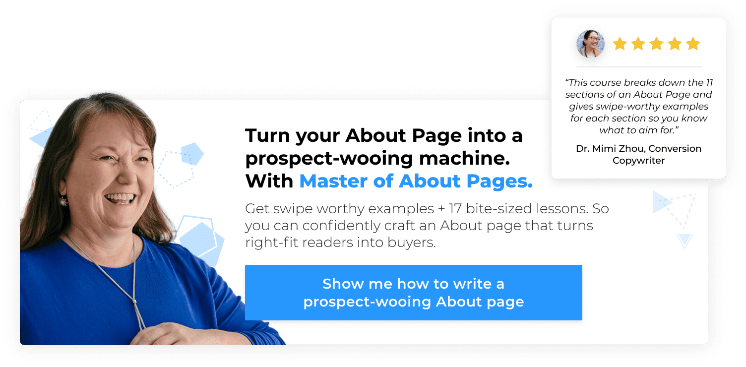 and has since filled a gap in the copywriting market with her Master of About Pages course for Copyhackers.