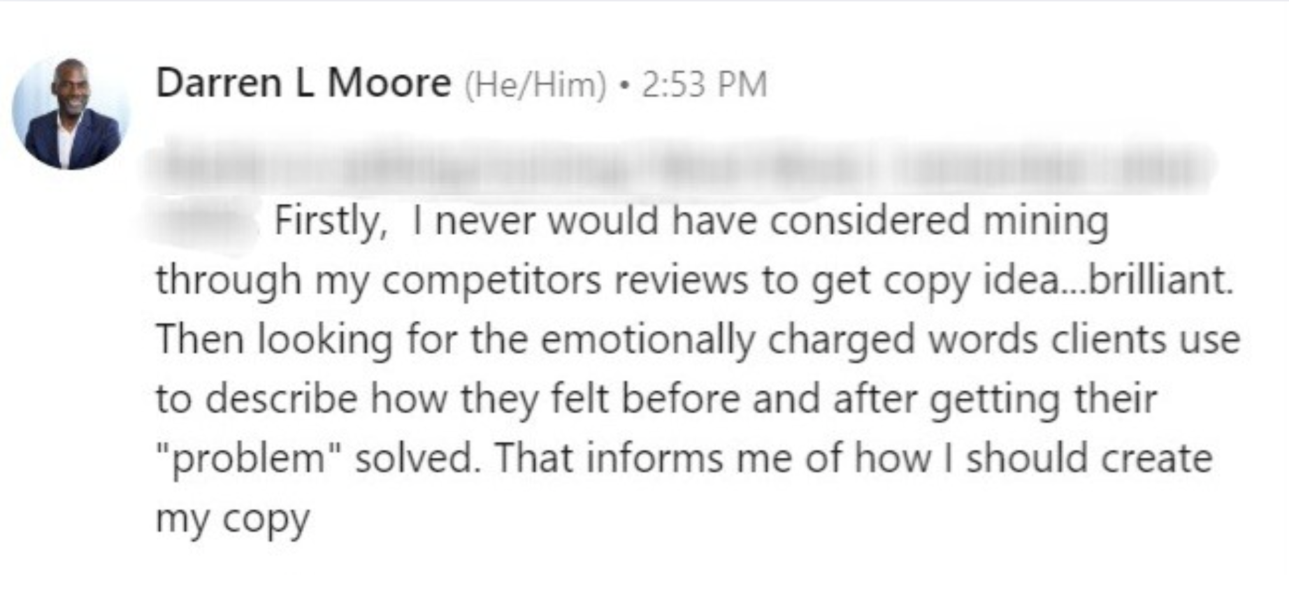 In the first half, I'll introduce you to a copywriting research technique called review mining.